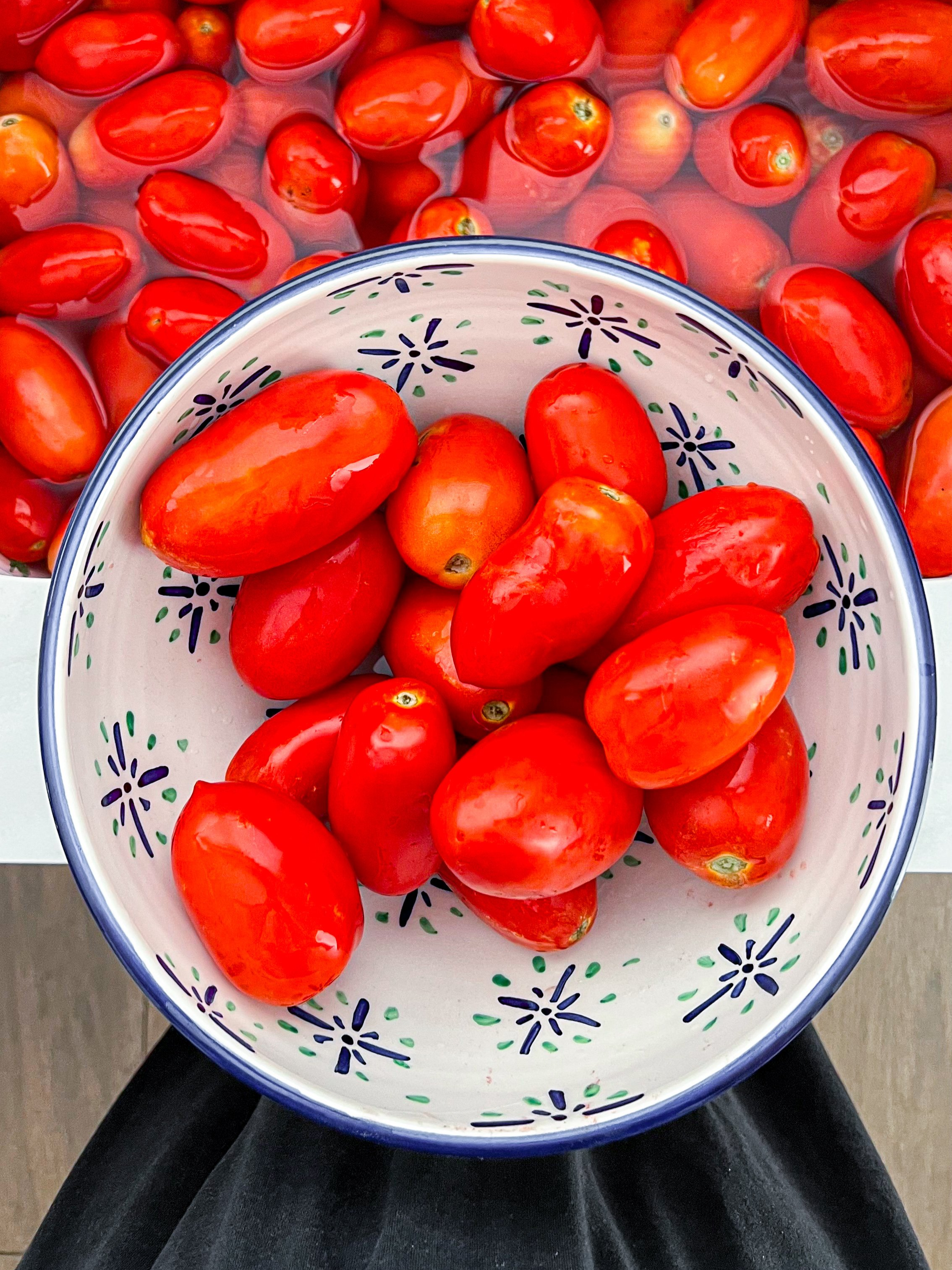 - De la pila, sacas unos 20-30 tomates, los colocas en un cuenco y te los dejas cerquita para empezar.