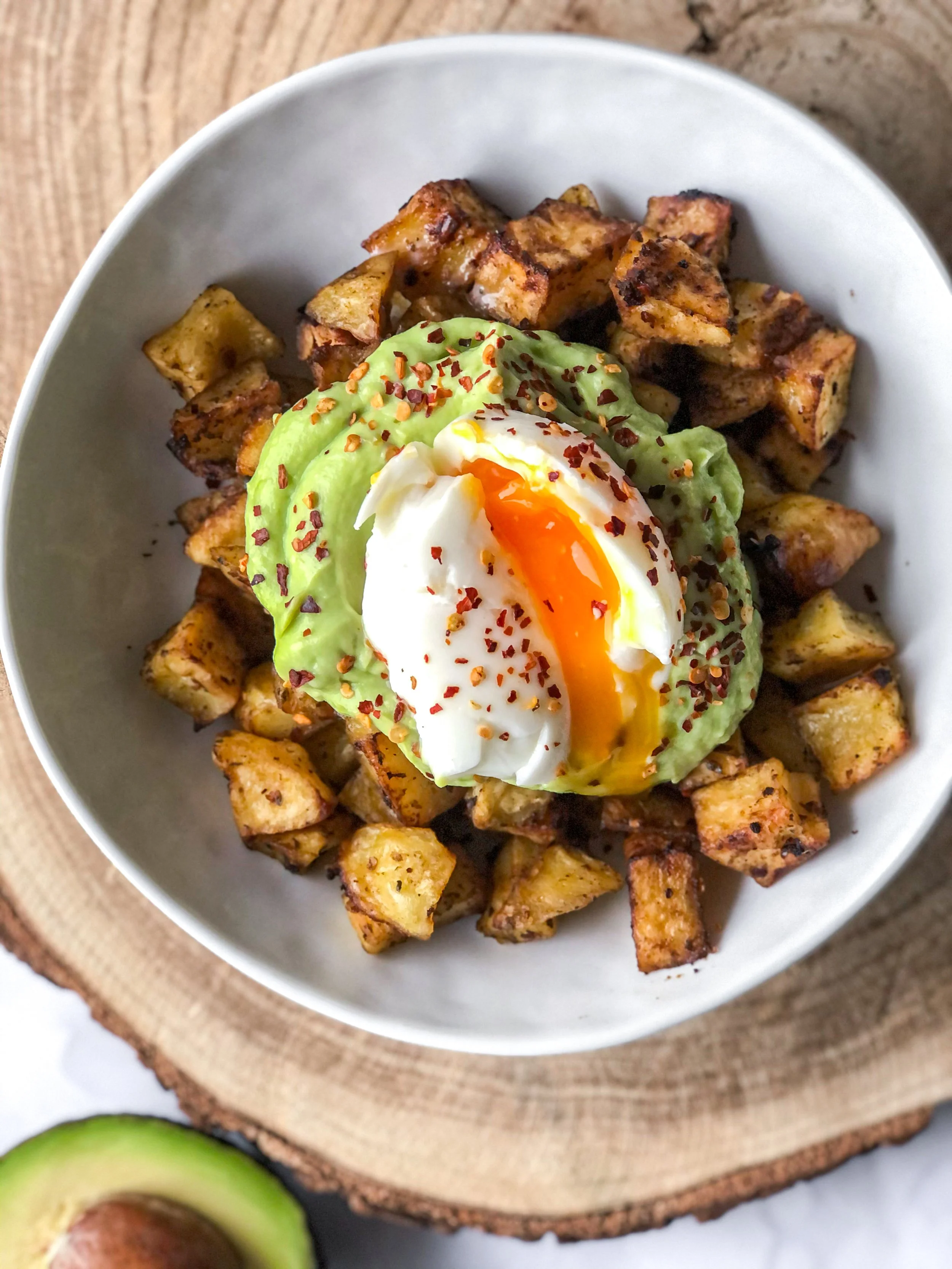 Dados de patata con crema de aguacate y huevo
